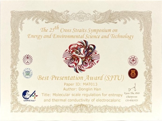 11月19-22日,第25届“亚洲校园”CSS国际学术会议在日本福冈举办。本届国际学术报告会由日本九州大学主办,伟德国际1946与韩国釜山国立大学、马来西亚理工大学联合举办,来自四所亚洲高校能源、环境、材料、化工领域的30多位教授和80余名研究生参加,公司4名优秀博士生入选参加活动并分别进行了口头汇报。在会议闭幕式上,公司博士生韩东霖论文Molecular scale regulationn for entropy and thermal conductivity of electrocaloric polymers获最佳论文奖,论文也获得推荐,将发表于EVERGREEN(Joint Journal of Novel Carbon Resource Sciences & Green Asia Strategy)期刊。