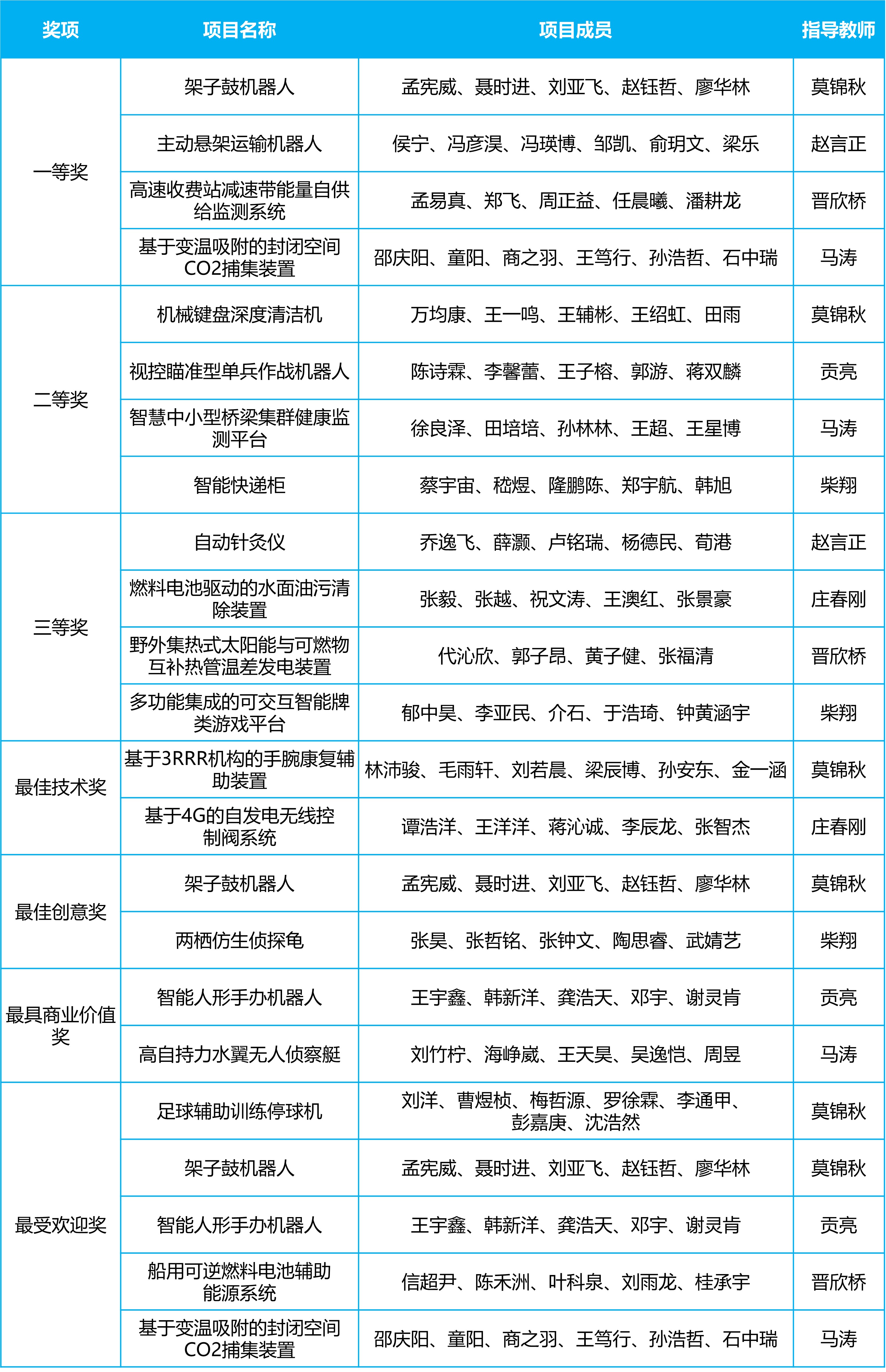 经校内外专家评审和研究生新生投票,评选出一等奖4项、二等奖4项、三等奖4项,最佳技术奖2项、最佳创意奖2项、最具商业价值奖2项、最受欢迎奖5项。