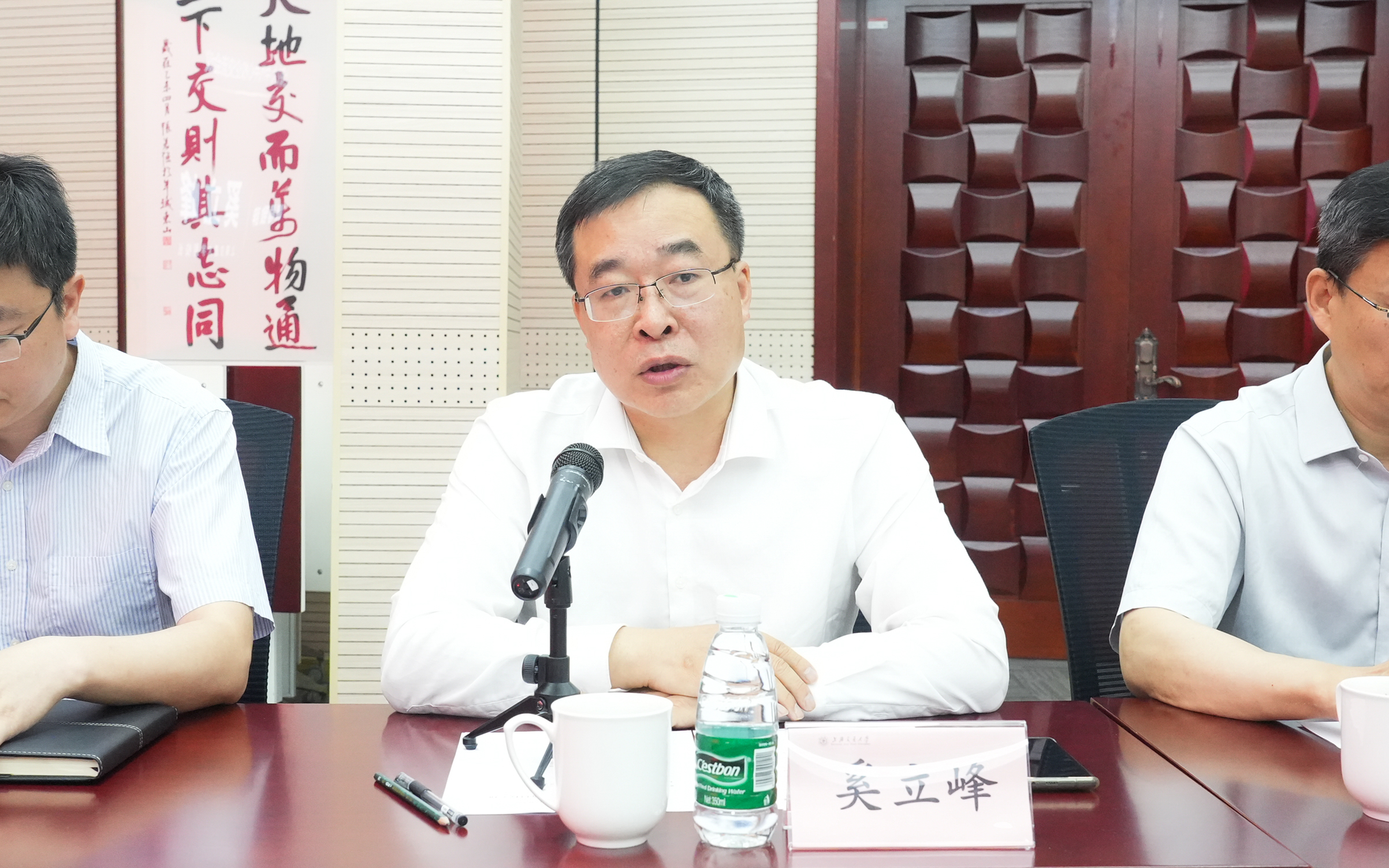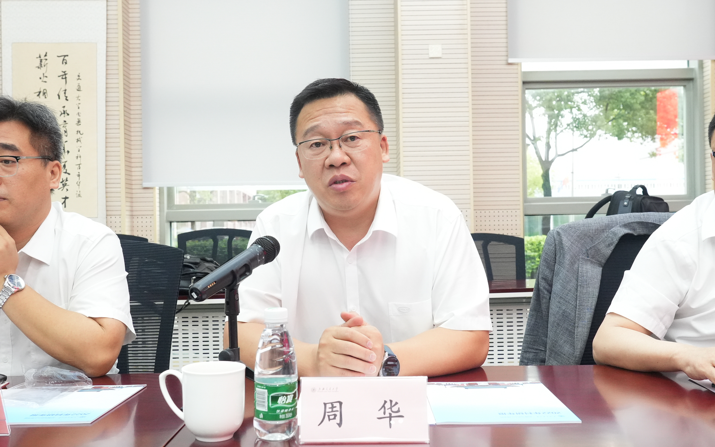 奚立峰致欢迎辞,介绍了公司总体情况、汽车相关专业发展历程,以及以上海交大为主体建立的上海南部科创中心与“大零号湾”发展现状,希望双方进一步加强合作,在产学研融合和科技成果转化等方面实现全面共赢。