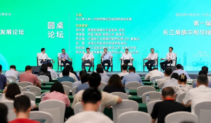 圆桌论坛由黄震院士主持。国家能源局华东监管局局长邱水录、申能(集团)有限公司董事长黄迪南、中国电力工程顾问集团有限公司董事长罗必雄、东南大学能源与环境公司经理肖睿、浙江省能源有限公司首席科学家朱松强、安徽海螺集团有限责任公司双碳总负责人陈永波围绕“长三角三省一市协同推动区域低碳绿色发展”进行了讨论与交流。
