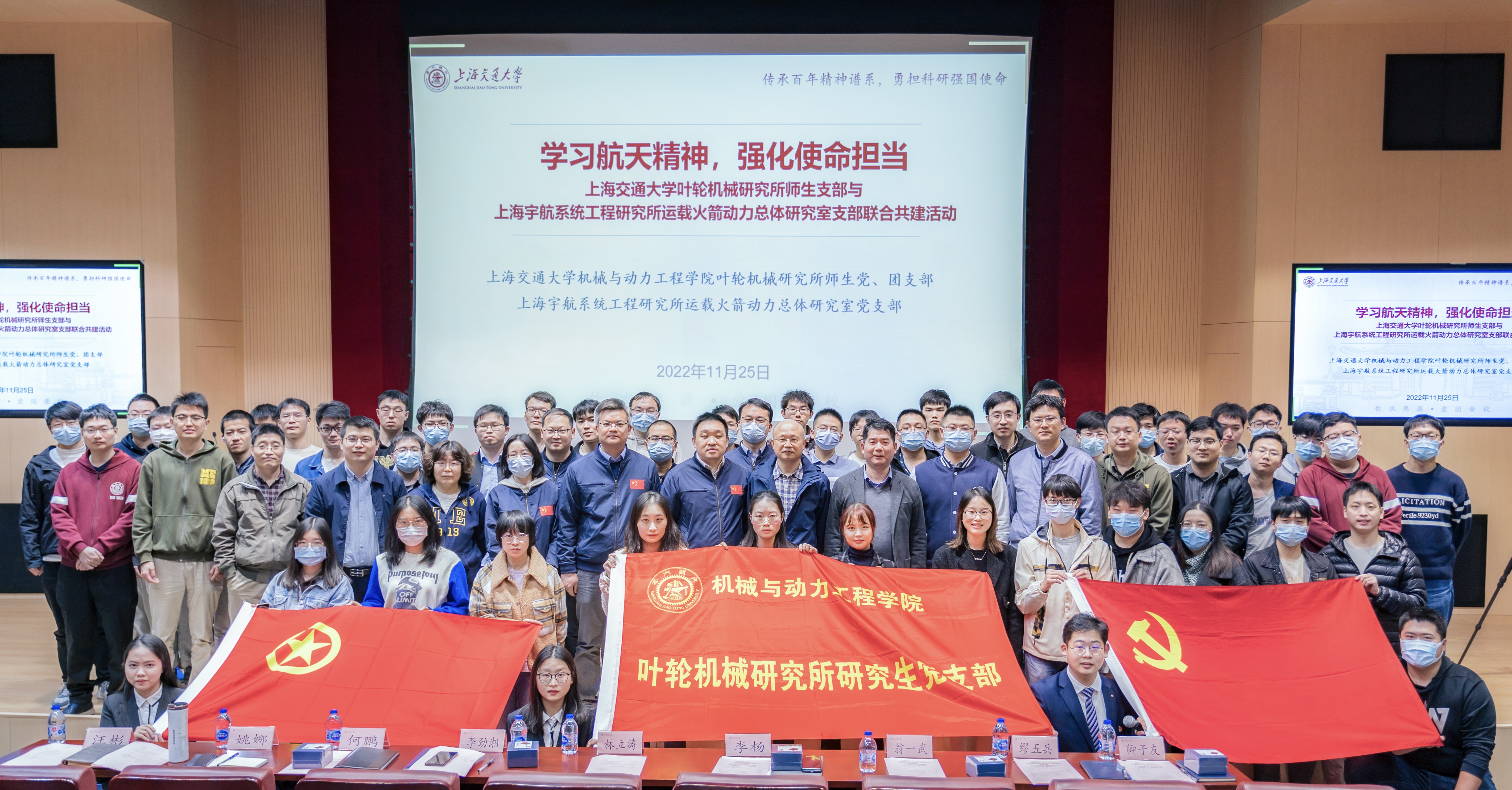 11月25日,叶轮机械研究所师生党支部与上海宇航系统工程研究所运载火箭动力总体研究室党支部联合举办“学习航天精神,强化使命担当”暨“传承百年精神谱系,勇担科研强国使命”学习贯彻党的二十大精神主题党日活动。会议采用线上线下相结合的方式进行。上海宇航系统工程研究所运载火箭动力总体研究室主任、党支部书记李杨,副主任缪五兵,专业副总师姚娜,主任设计师卿子友,副主任设计师汪彬;上海交大公司党委书记林立涛,员工处副处长李劲湘,叶轮机械研究所教工党支部书记翁一武及师生党员等参加了活动。活动由叶轮机械研究所博士生党支部贺蓉主持。