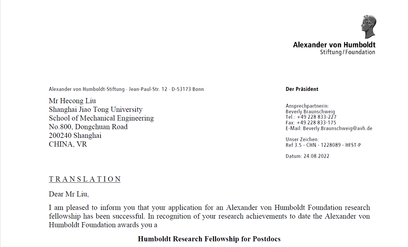 近日,叶轮机械研究所应届博士毕业生刘何聪获得德国洪堡基金会的博士后研究奖学金(Humboldt Research Fellowship for Postdoctoral Researchers)资助,入选德国“洪堡学者计划”。刘何聪将加入德国杜伊斯堡-艾森大学Christof Schulz教授团队,开展击穿光谱方面的研究。Christof Schulz教授是德国最高科技奖Leibniz奖获得者、能源与燃烧领域期刊Progress in Energy and Combustion Science主编。