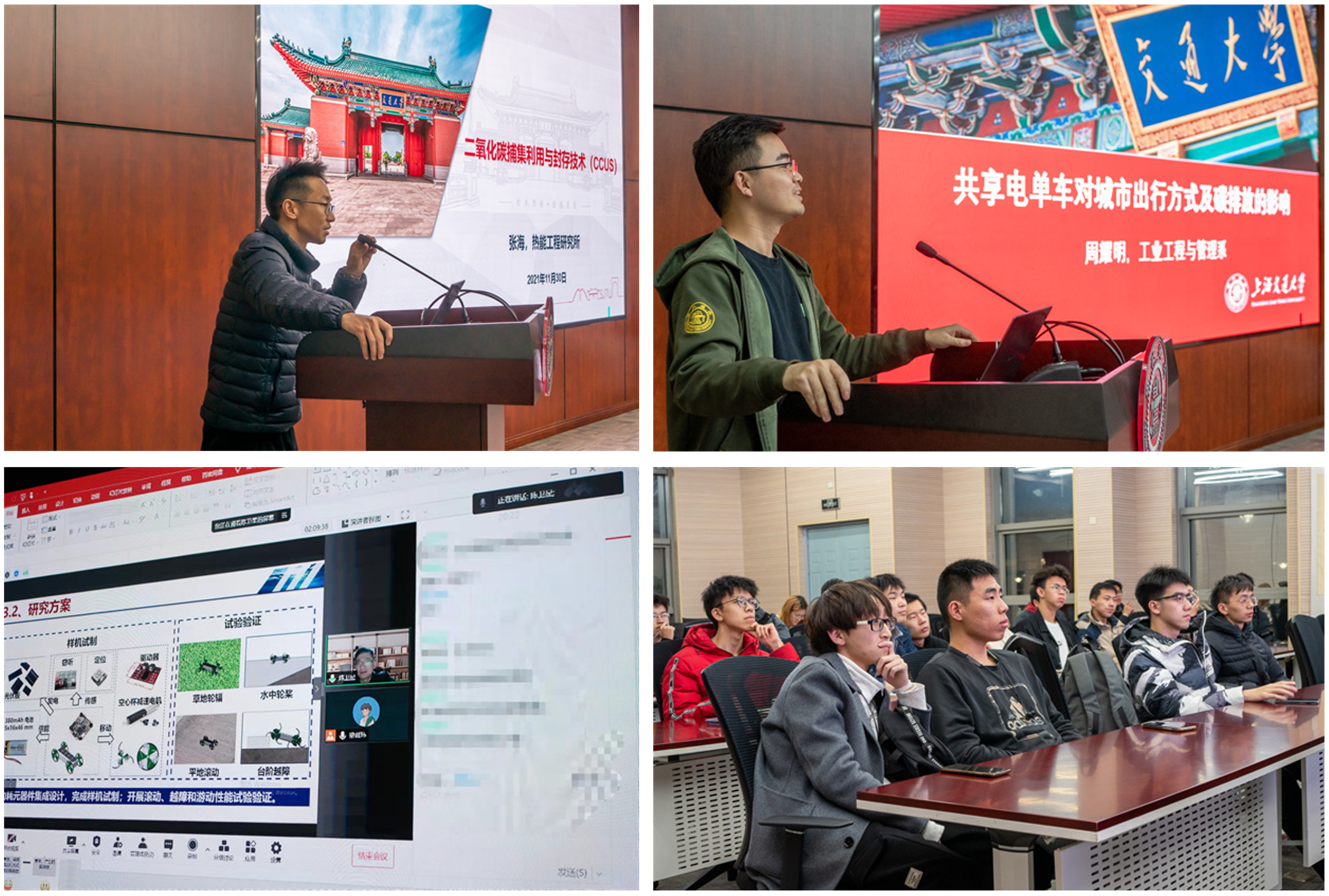 首期学术沙龙采用线上线下相结合的方式,张海、周耀明、陈卫星分别围绕二氧化碳捕集利用与封存技术(CCUS)、共享电单车对城市出行方式及碳排放的影响、新型自供能水下机器人展开学术交流,活动吸引了30余人参加。交流环节,针对能源领域建设周期比较长、投资回报率不高、碳排放交易市场规模等问题,老师们一一为同学们答疑解惑。