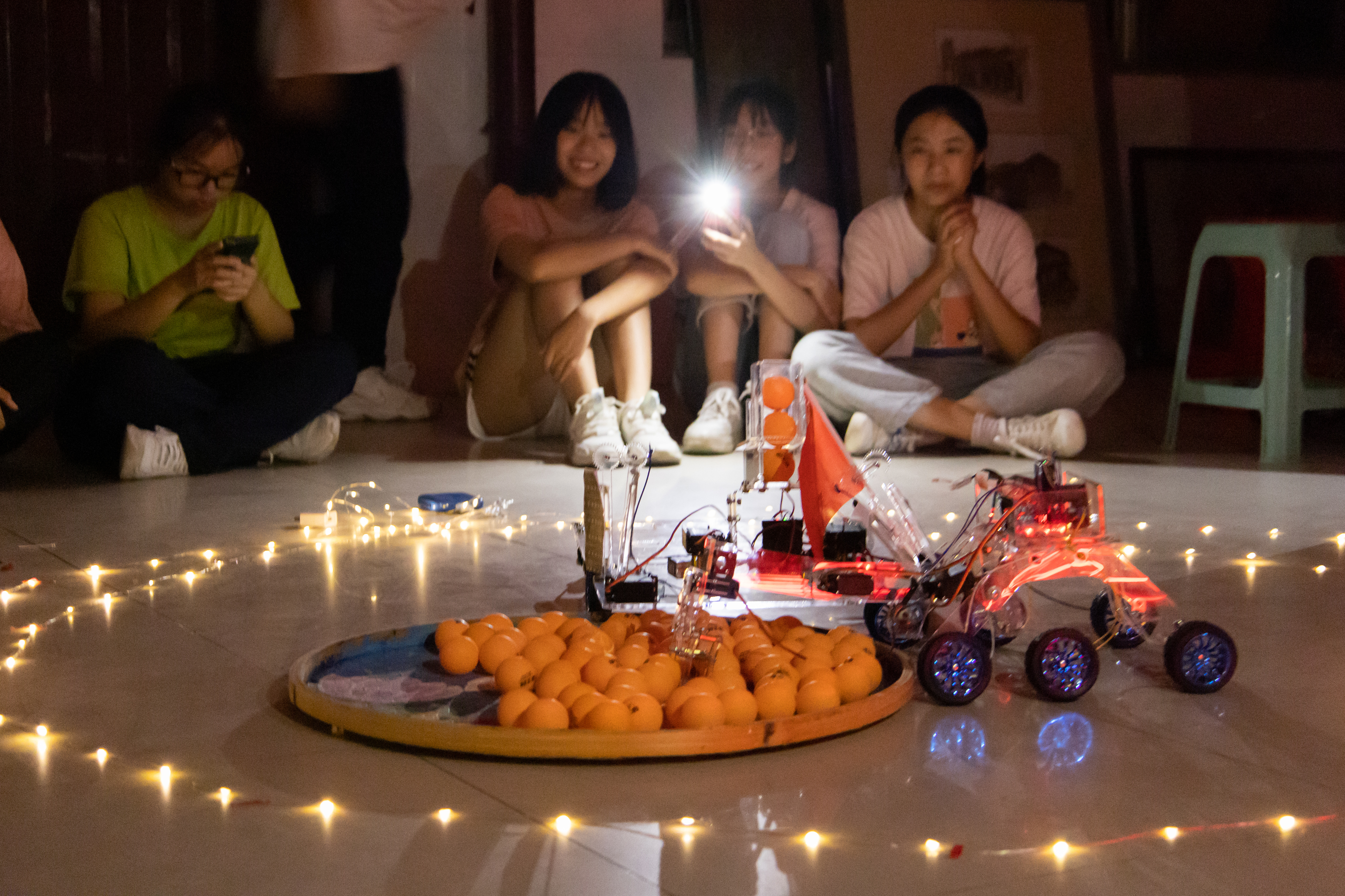 组织开展“筑梦星空”项目展,九个小组各派出两位同学,在布置好的由灯带和簸箕画组成的地月系场地上,进行具有挑战性的“探月工程”。“航天器”——大车携着五星红旗,依次完成了搭载月球车、展开太阳能板、电磁弹射试验等任务;小车利用机械臂抓取象征月壤的乒乓球,顺利返回地球。同学们在充分享受实践成果的过程中,体悟了机械结构与电路控制的魅力,感受到航天人勇于攻坚的精神。