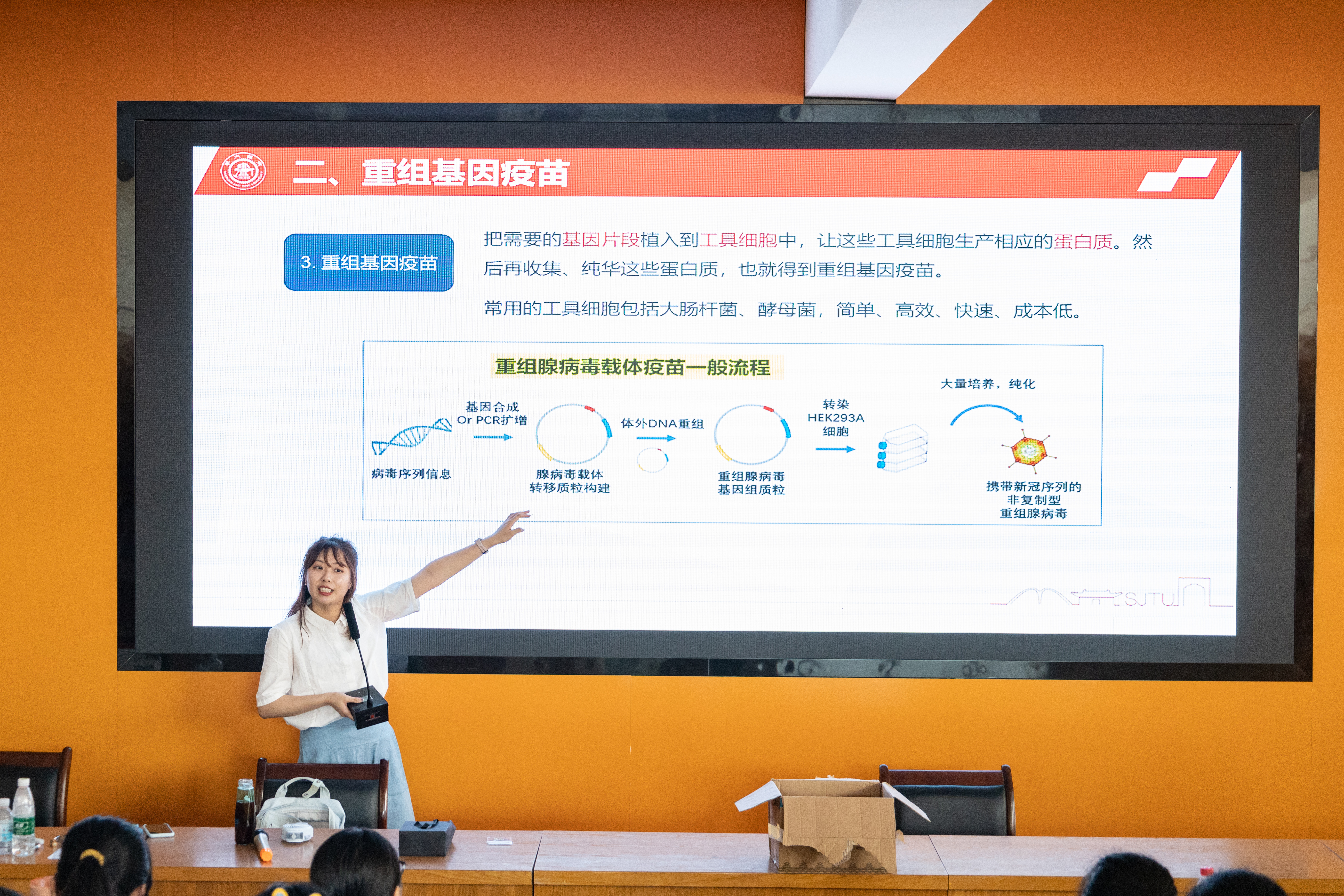 在建党百年之际,结合全民疫苗接种的时事热点,团队开展《百年党史教育之中国精神》和《疫情时代,你了解疫苗吗》专题讲座,普及科学知识,传递深刻内涵,厚植家国情怀与红色精神,引导同学们关注社会热点,积极思考探索,紧跟时代浪潮。