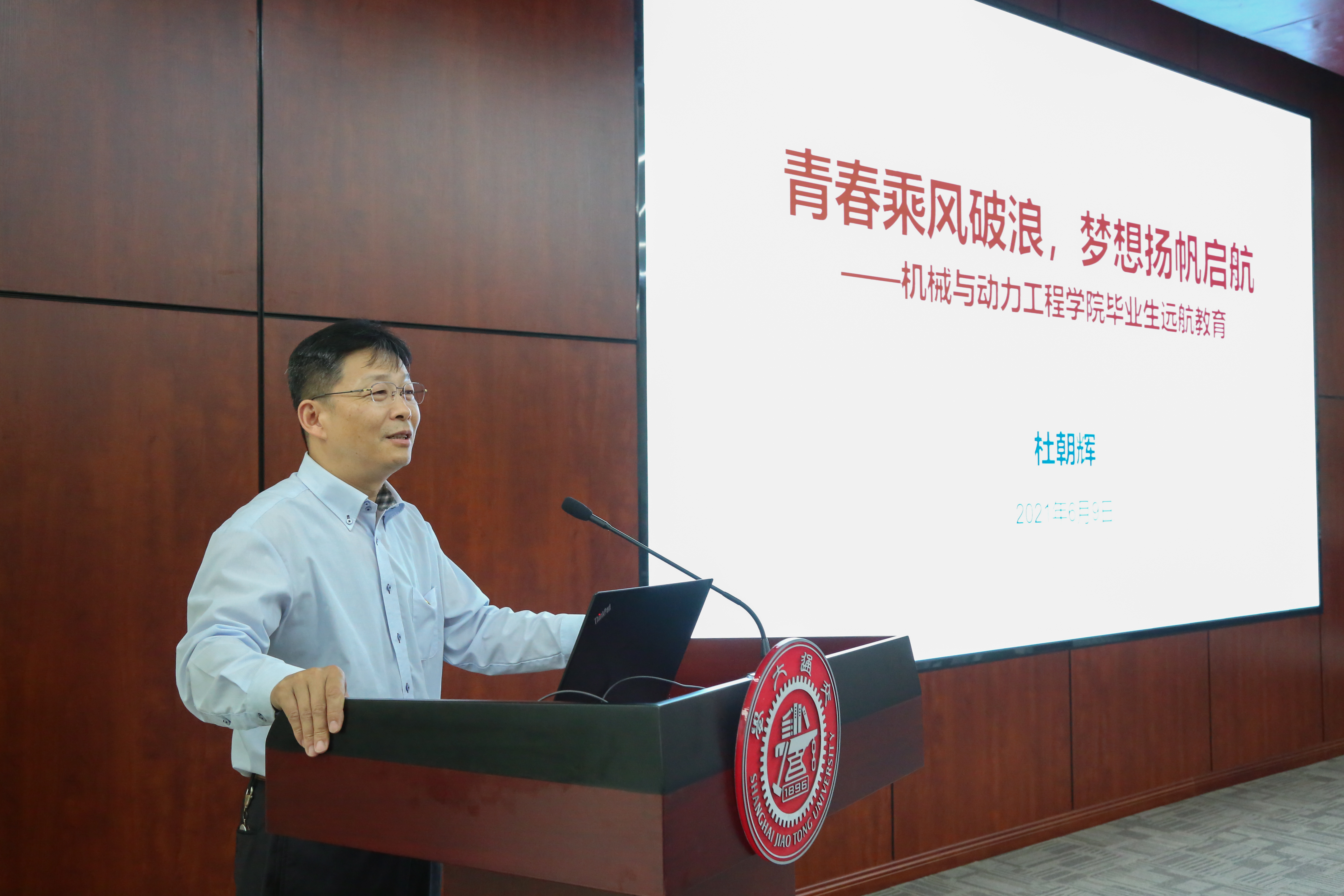 杜朝辉以“青春乘风破浪,梦想扬帆启航”为题,为毕业生党员们上了一堂生动的党课。他带领同学们回顾党的历史,阐述中国共产党人的初心和使命。他对毕业生党员同学提出四点要求。一是不忘初心,坚定理想信念。将“党史”、“四史”学习与校史、院史相结合,传承交大人与祖国同行的传统,践行老一辈科学家矢志报国的精神。二是志存高远,脚踏实地工作。勤奋笃实,扎根专业,锻炼本领和能力,知行合一,成为实干家。三是担当作为,不负时代使命。爱国是青春的底色,应奋发有为,努力向上,追求卓越,为国家的富强而努力。四是奉献青春,焕发绚丽光彩。做到“四讲四有”、“四个合格”,在今后的求学及工作中,发挥党员先锋模范作用,为国家建设、推动新时代发展贡献力量。