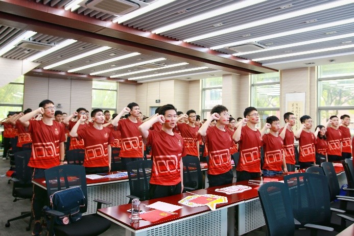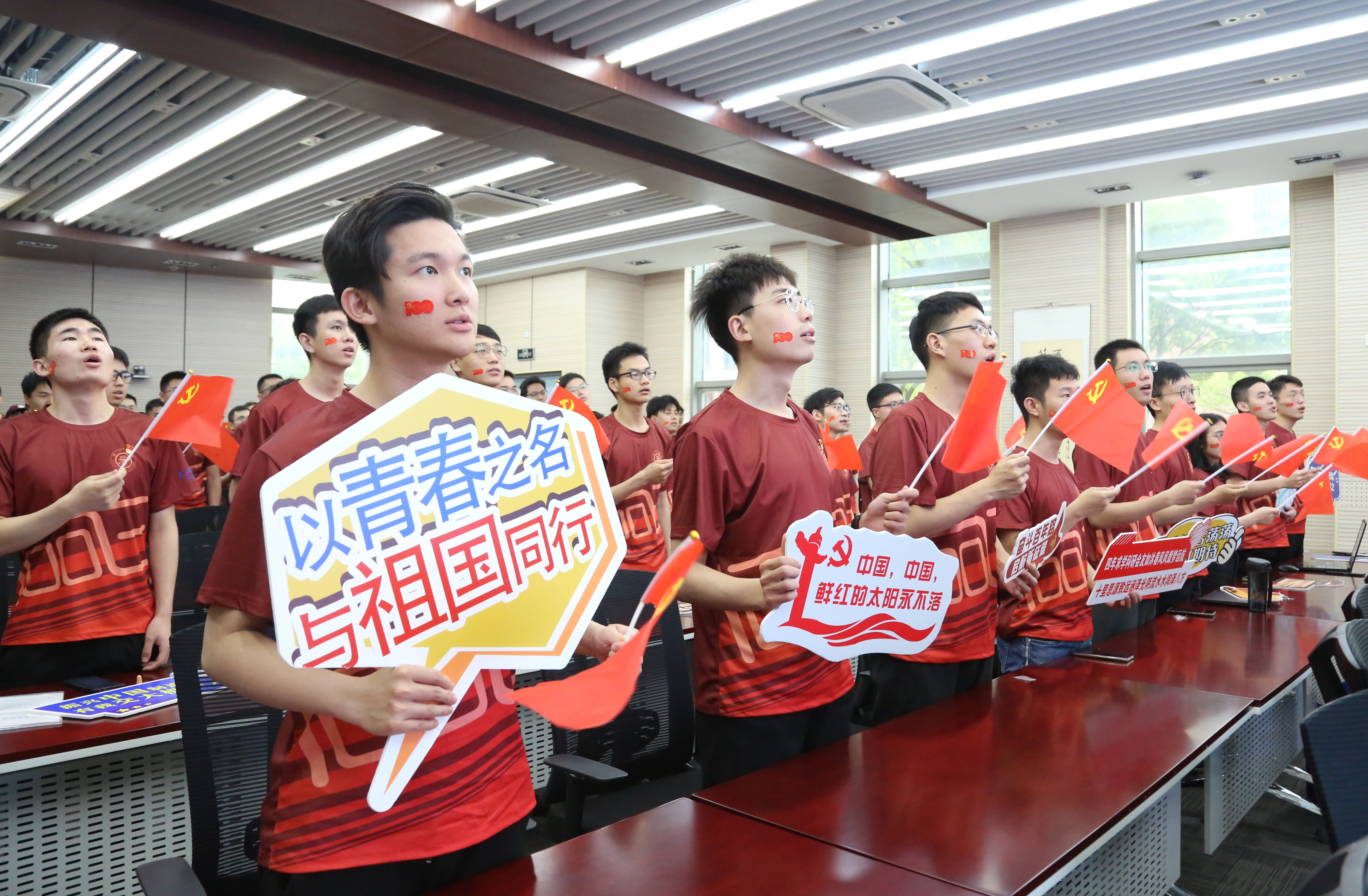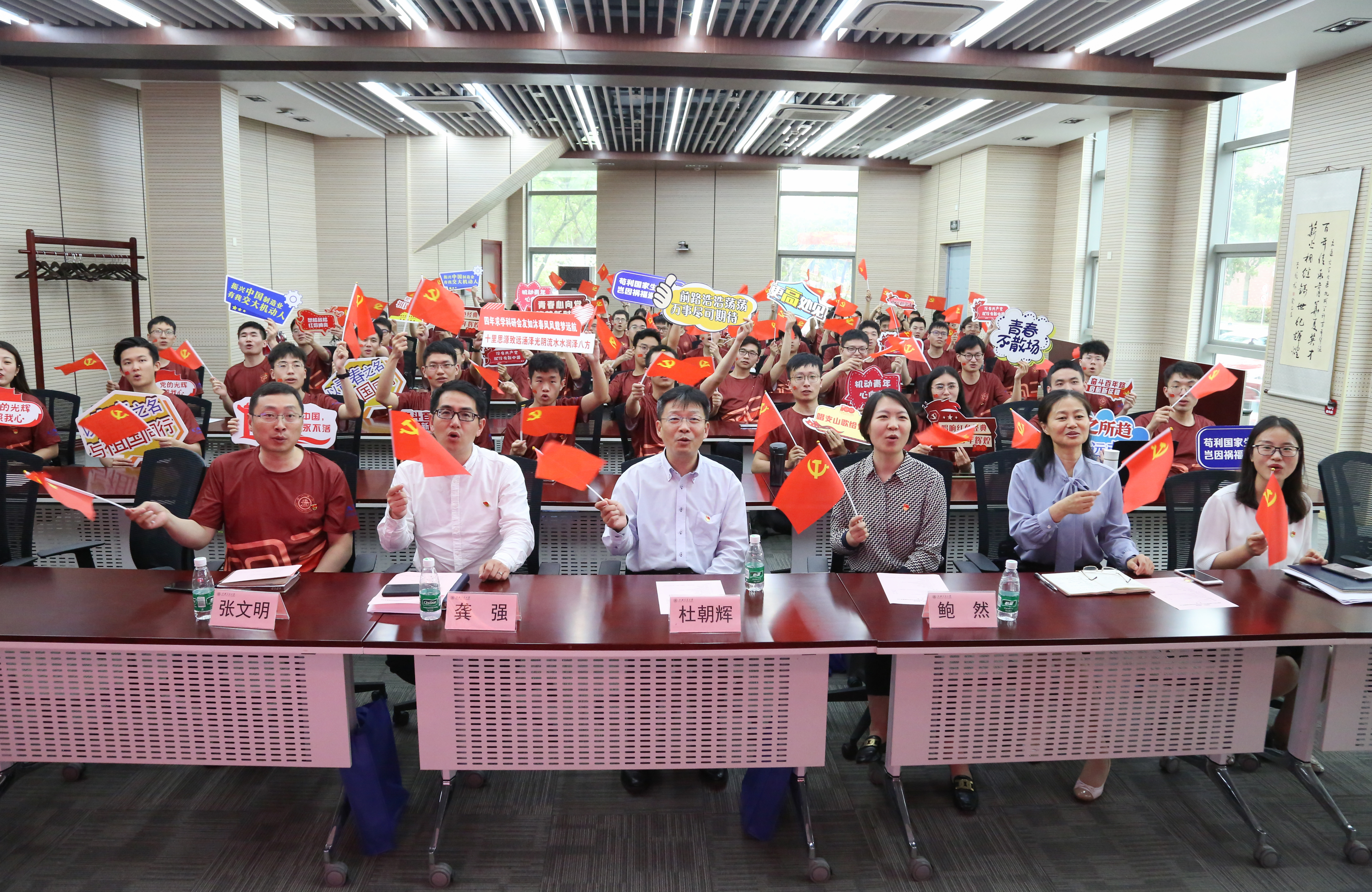 全体毕业生党员面对党旗,重温入党誓词。在《歌唱祖国》的嘹亮歌声中,与会师生齐挥党旗,向中国共产党献上生日祝福。