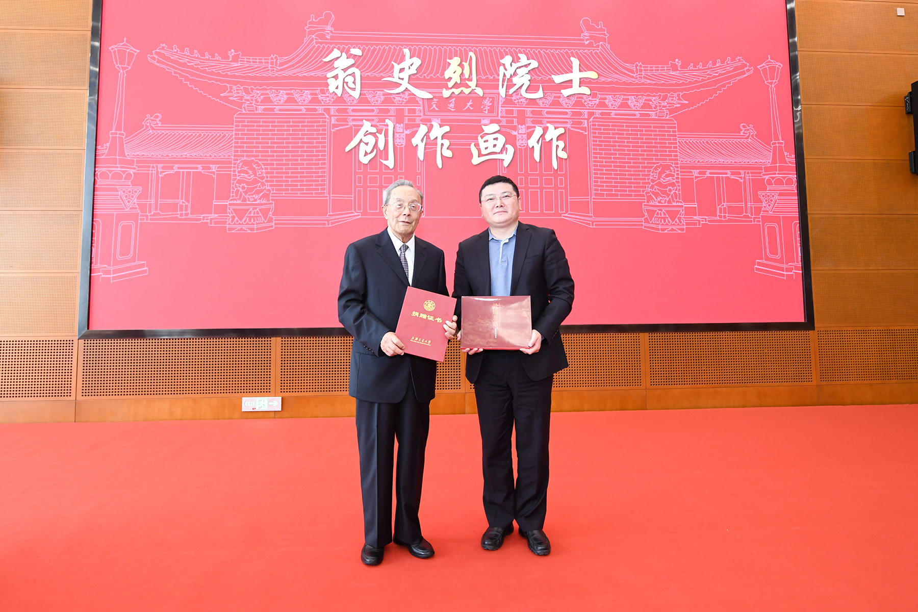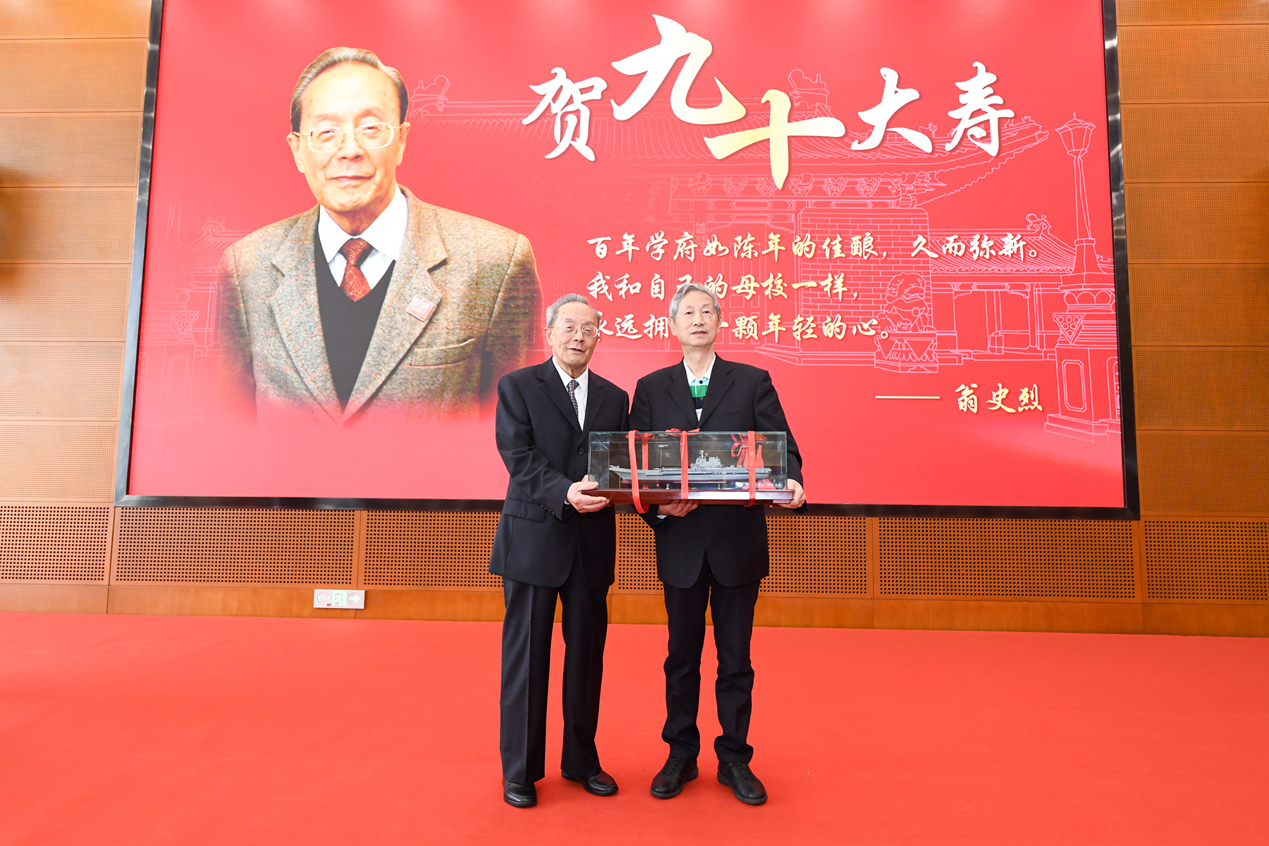 杨振斌、林忠钦代表公司,向翁史烈院士赠送其本科成绩单和闵行二部发展规划复制品作为纪念。703研究所闻雪友院士等单位和个人,作为翁史烈院士的“长期战略合作伙伴”,向翁院士赠送了航母舰船动力模型,感谢他在学界、业界做出的杰出贡献。翁院士向大家赠送自己的计算机作画画册留念,并把签名版赠送给档案文博管理中心。