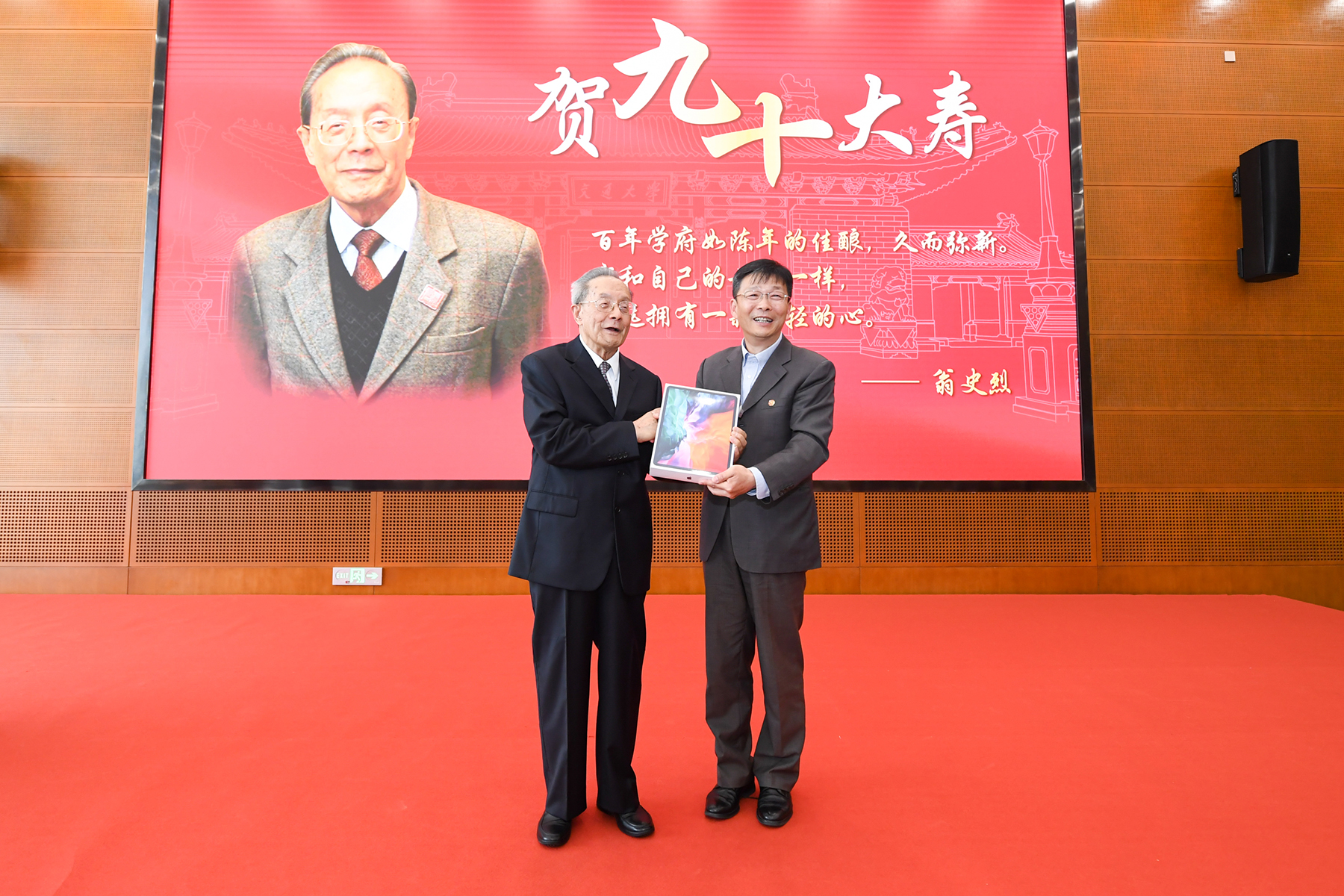 杨振斌代表全校师生,对翁史烈院士90华诞表示热烈祝贺,对其在公司发展历程中做出的杰出贡献表示崇高敬意。他指出,翁院士作为教育家,立德树人,为国育才,治学严谨,提携后辈,桃李遍天下;作为董事长,与公司领导班子带领全体交大人艰苦奋斗、努力拼搏,为开创公司发展新天地、争创世界一流大学不断探索、锐意改革,令人肃然起敬;作为科学家,满怀强烈的报国之心和强国之梦,做出了卓越贡献。他希望全校师生倍加珍惜老交大人艰苦奋斗奠定的基业,不忘初心再图强、实事求是促改革、吐哺握发聚人才,在推进建设世界一流的征程中创造新的辉煌。