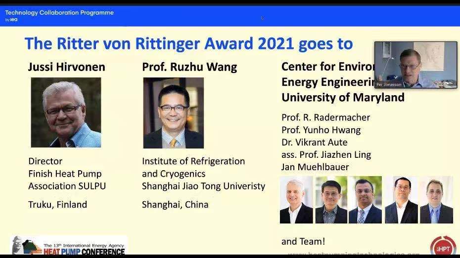 4月26-29日,国际能源署IEA主办的第13届国际热泵会议在韩国济州岛召开,会议线上线下同步进行,公司王如竹教授获Rittinger国际热泵奖(Peter Ritter von Rittinger International Heat Pump Award)。