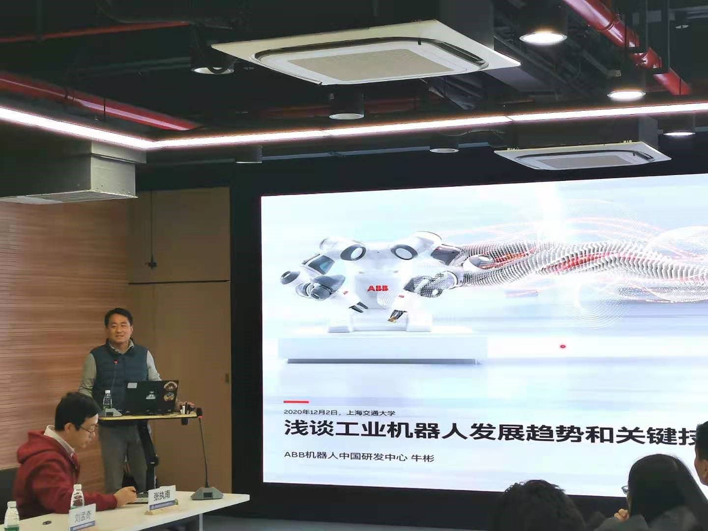 ABB机器人中国研发中心运动控制首席工程师牛彬做《浅谈工业机器人发展趋势和关键技术》学术报告,围绕工业机器人的发展历史、发展现状、发展趋势及关键技术进行了详细介绍。牛彬希望同学们在学好相关课程的同时,积极参加实践项目,为今后的就业积累实践经验。