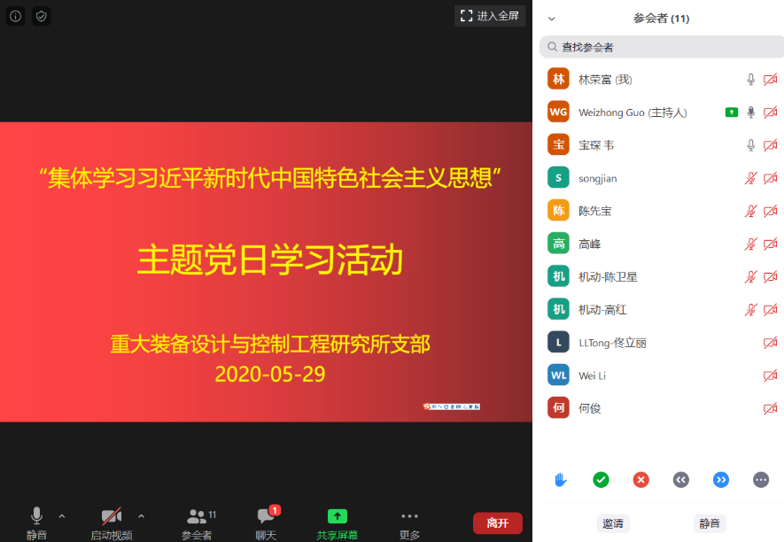 5月29日,重大装备设计与控制工程研究所党支部线上开展了集体学习“习近平新时代中国特色社会主义思想”主题党日活动,11名党员参加了活动。活动由党支部书记郭为忠主持。