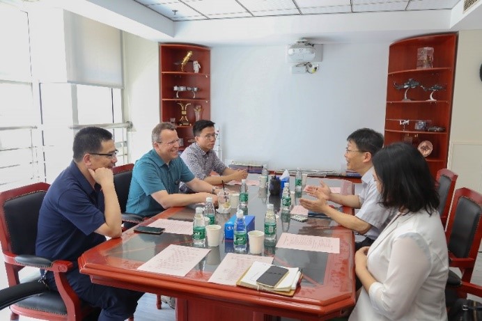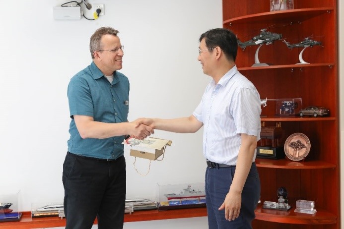 杜朝辉对Eckhard Groll的到访表示欢迎,并回顾了双方的历史合作情况。王皓就双博士联培项目与Eckhard Groll进行了深入讨论。王丽伟围绕员工交换项目中课程匹配与学分转换遇到的难题,与Eckhard Groll探讨了可能的解决措施。