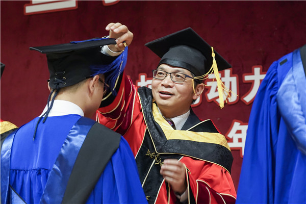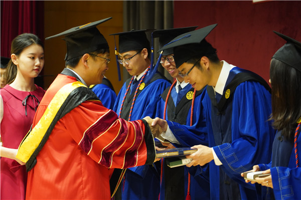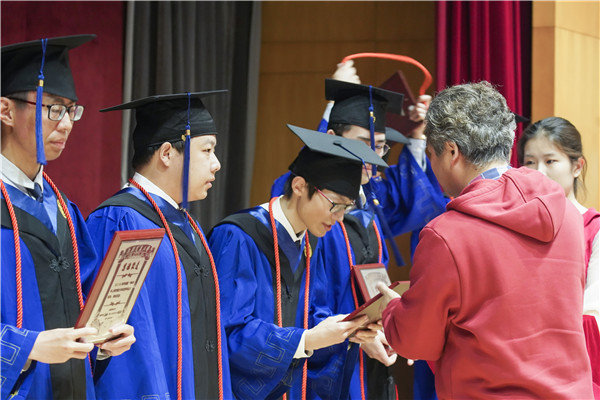 在神圣庄严的学位授予仪式环节中,导师为毕业生依次颁发学位证书并合影留念。