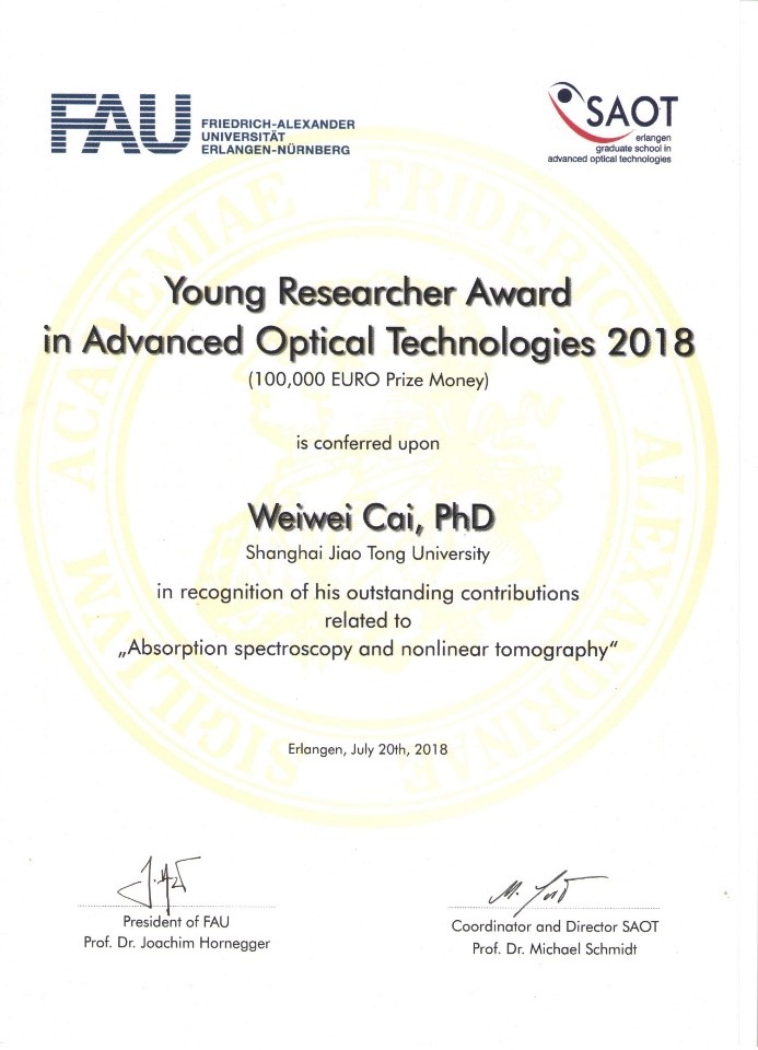 7月20日,德国埃尔朗根高等光学研究院青年科学家奖颁奖典礼举行,公司叶轮机械研究所青年教师蔡伟伟获此殊荣。授予其该奖是为表彰他在吸收光谱及非线性层析方面做出的突出贡献,埃尔朗根纽伦堡大学董事长Joachim Hornegger为其颁奖并授予10万欧元奖金,鼓励双方继续开展合作研究。