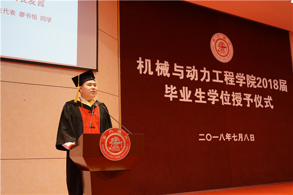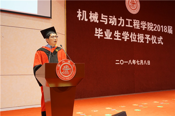 14级钱学森班、首届致远工科荣誉计划学子廖书恒代表全体毕业生发言。他结合自己暑期考察工厂见识到落后的经历,表示要用自己的努力为中国制造业添砖加瓦,为中国制造2025战略规划的实现奉献自己的力量。他鼓励毕业生们要心怀责任与担当,谨记校训,志存高远,砥砺奋进,不负交大机动人这一称号。