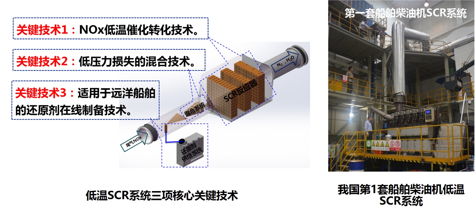 项目团队经过多年攻关,攻克了低温SCR催化剂、低压力损失混合导流、可靠的还原剂供给三项关键技术:通过可控预混合燃烧快速合成纳米低温SCR催化剂技术,大幅提高了低温下SCR系统NOx的转化效率,220℃时NOx转化率达90%以上,150℃时从10%大幅提高到75%;发明了我国第一套船用SCR系统导流装置,压力损失比现有导流技术降低90%以上;发明了尿素溶液在线制备技术,大幅减少了还原剂供给系统体积和成本。经第三方检测验收,项目开发的低温SCR催化剂达到国际领先水平,SCR关键技术达到国际先进水平,满足Tier III标准。