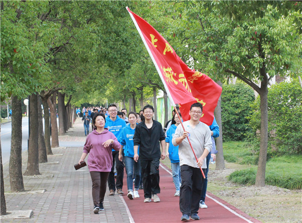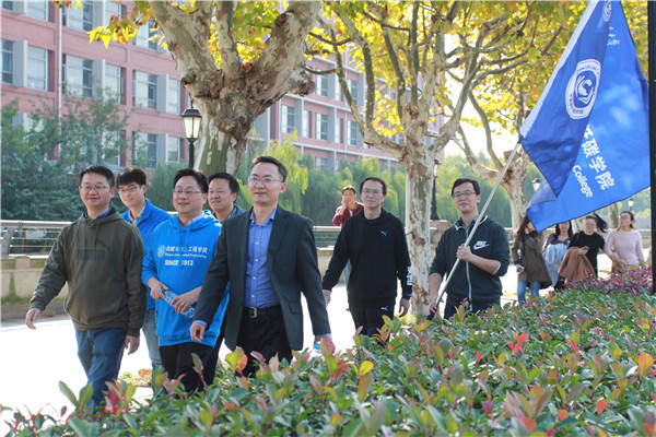 简短的启动仪式后,健步走队伍在院旗的指引下浩浩荡荡地出发了。