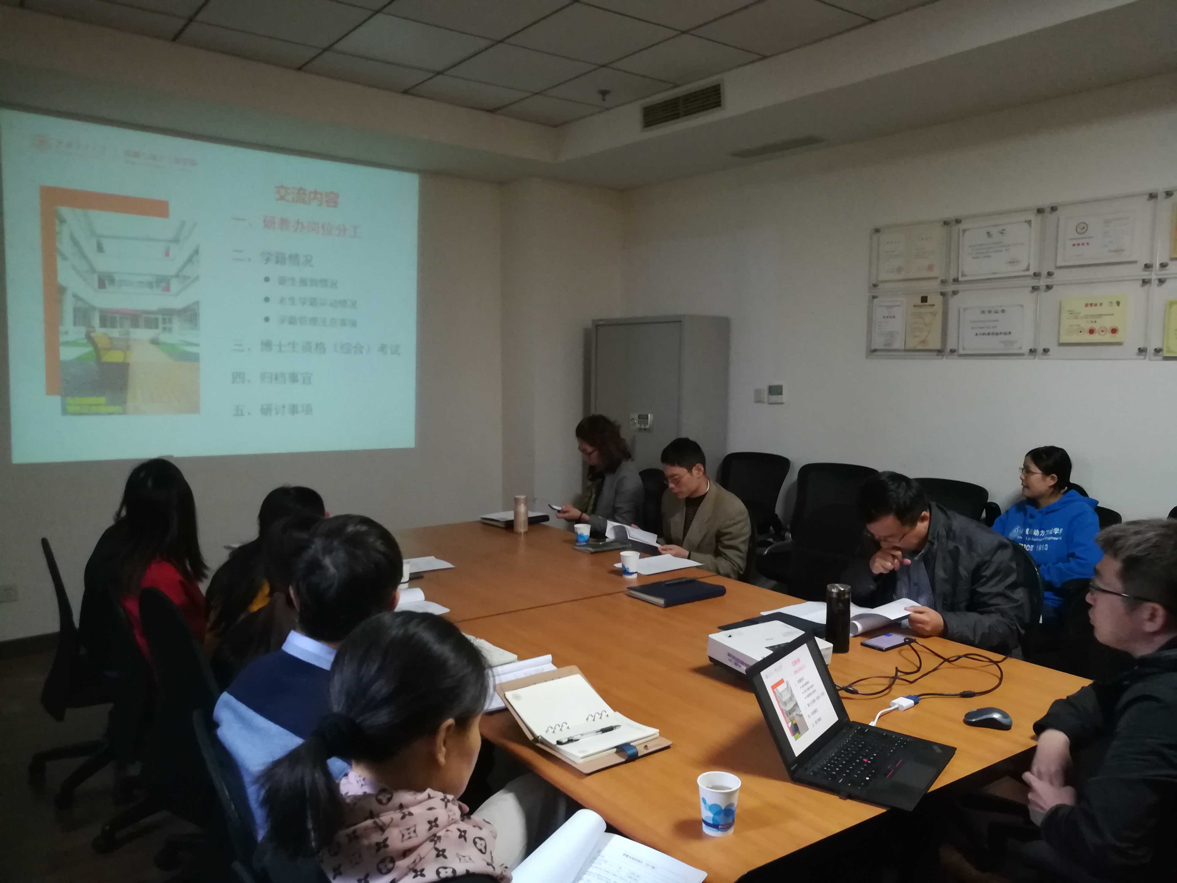 思政教师郭莉、余天佐、张碧菱、谷学森分别介绍了研究生档案管理、综合评价、博士生学术论坛等内容,交流了存在的一些问题及思考。与会老师结合实际工作对特殊毕业生档案问题、综合评价科研成果认定、学术论坛纳入培养环节等具体问题进行了充分讨论,并确定了后续推进的具体原则和办法。