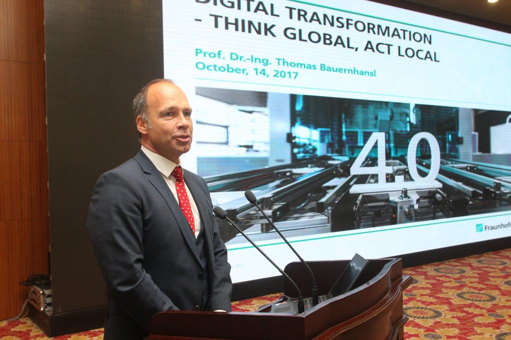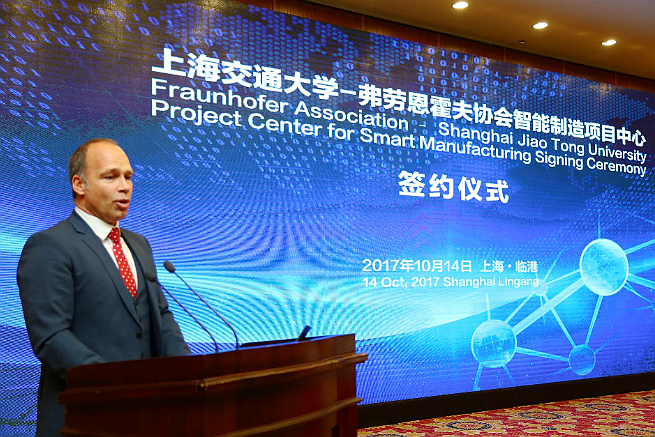 Thomas BAUERNHANSL所长代表弗劳恩霍夫协会致辞,向所有支持弗劳恩霍夫协会在中国组建第一个项目中心的各界人士表示感谢。他认为中德双方的合作目标是开展信息物理系统的研究、在上海建立未来制造系统的示范线,同时在公司产品、企业人才培训、企业技术服务等方面联合开展工作,建立起中德双方的长期合作。
