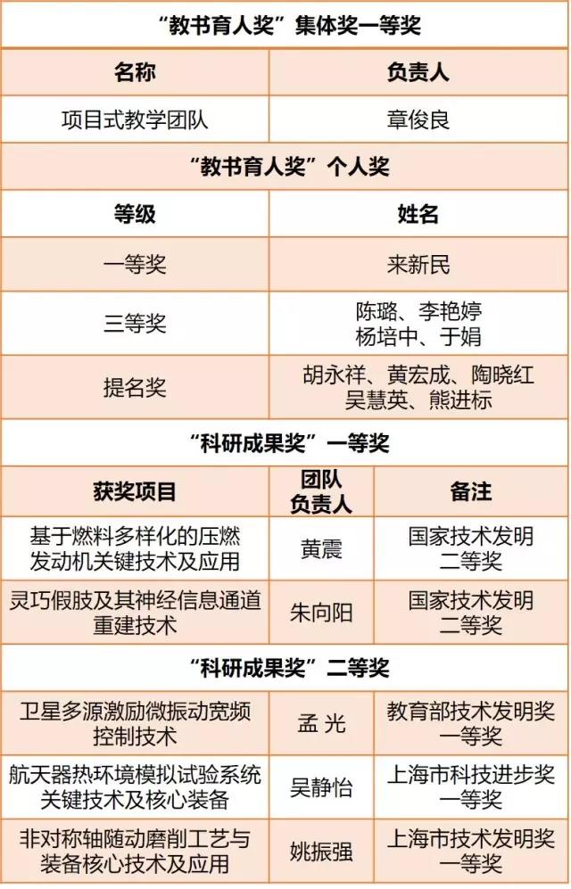 本次评选中,上海交大12位老师和2个集体获得首届教书育人奖一等奖,7个科研团队获得科研成果奖一等奖。17位老师、5个教学团队获得教书育人奖二等奖,30位老师获得教书育人奖三等奖,52位老师获得教书育人奖提名奖。38个团队获得科研成果奖二等奖。