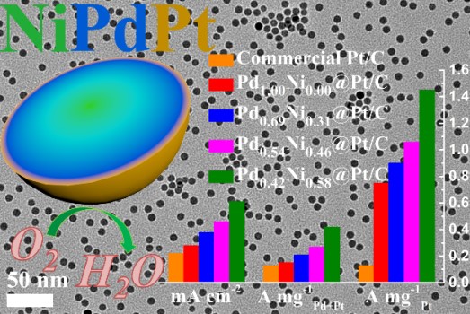 课题组长期以来从事低铂、超低铂催化剂和膜电极的研发,目前该项研究成果以 “Composition-Graded PdxNi1-x Nanospheres with Pt Monolayer Shells as High-Performance Electrocatalysts for Oxygen Reduction Reaction”为题,在线发表于美国化学学会著名期刊《ACS Catalysis》上(影响因子:10.614),结果已经过实验室验证,将进行催化剂的批量化制备技术的研发。