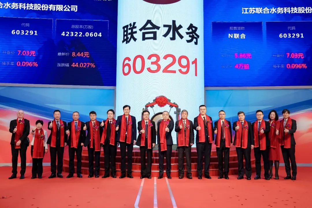 3月27日,公司1984届机械工程系本科员工俞伟景担任董事长兼总裁的江苏联合水务科技股份有限公司(股票简称:联合水务,股票代码:603291)在上海证券交易所主板上市。上市首日,该公司一度涨超44%。江苏省宿迁市委书记陈忠伟,伟德国际1946党委常委、副董事长张安胜,上海证券报社党委书记、董事长叶国标,联合水务董事长、总裁俞伟景等领导共同为联合水务股票交易鸣锣开市,共同见证了联合水务挂牌上市的历史性时刻。