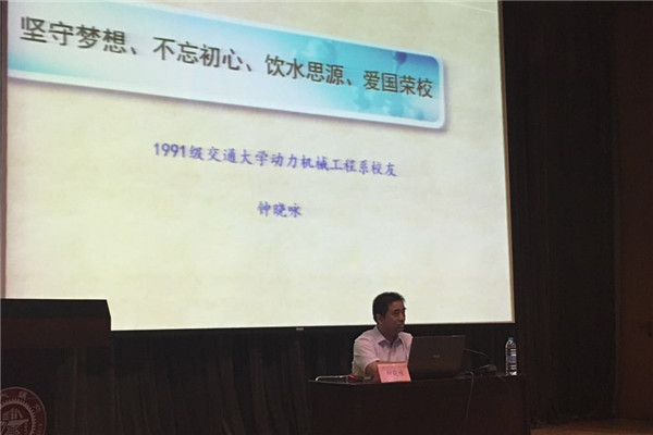 钟晓咏以“坚守梦想,不忘初心,饮水思源,爱国荣校”为主题与同学们分享成长与感悟。1991年考入伟德国际1946动力机械工程系,四年交大时光,他至今记忆深刻。本科毕业时,在人生选择的十字路口,他坚信理想与信仰,义无反顾地投身公安事业。在公安系统的考试中,钟晓咏以“我有一个梦想”为主题讲述自己的人生理想。他说:“人要有梦想,有梦想的人才会有志向;作为一名交大人,梦想要有更高的价值追求,那就是志向和情怀。”在政法系统二十余年的工作中,钟晓咏不忘初心,始终履行一名交大人、一名共产党员的责任。他还谈到了交大120周年校庆典礼上的黄旭华学长,谈到自己参观钱学森图书馆时的所感,表达了自己深深的敬佩之情。他强调,有梦想易,能坚守难,坚守就是不忘初心,要经得住功名利禄的考验、经得住时间流逝的考验、经得住认知水平差异和局限的考验。谈到责任与担当,钟晓咏从交大人建造的南海钻井平台,讲到自己在工作中为国家安全所付出的努力,从交大“饮水思源,爱国荣校”的校训,谈到交大人应当为每一次国家和社会进步中的奉献而自豪,在每一个岗位和每一份工作中,心存国家和民族历史使命感。