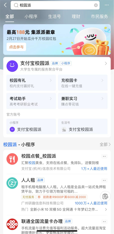 步骤一:支付宝首页搜索校园派,点击“充校园卡”